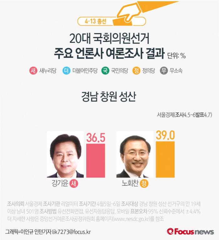 (서울=포커스뉴스) 서울경제가 여론조사기관 리얼미터에 의뢰해 7일 발표한 결과에 따르면 경남 창원 성산에서 새누리당 강기윤 후보의 지지율은 36.5%, 정의당 노회찬 후보의 지지율은 39.0%인 것으로 나타났다.