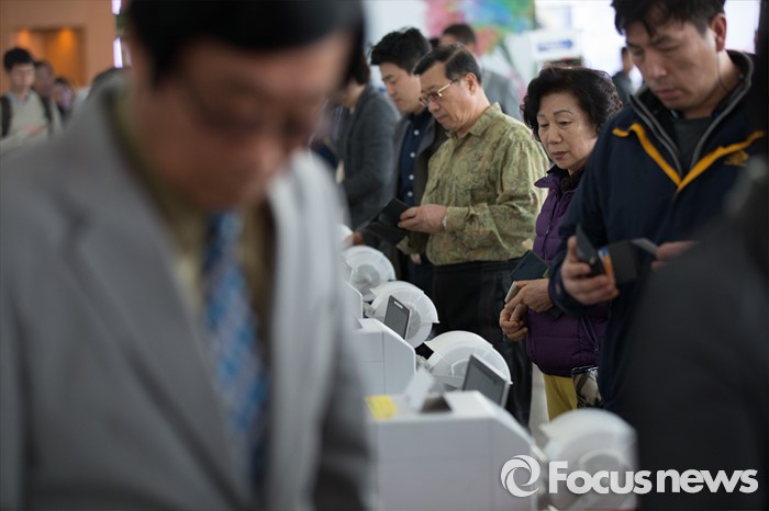 (서울=포커스뉴스) 4.13총선 사전투표 첫째날인 8일 오전 서울 용산구 서울역에 설치된 남영동 사전투표소에서 시민들이 투표를 하고 있다. 사전투표는 4.8~4.9일까지 진행된다.