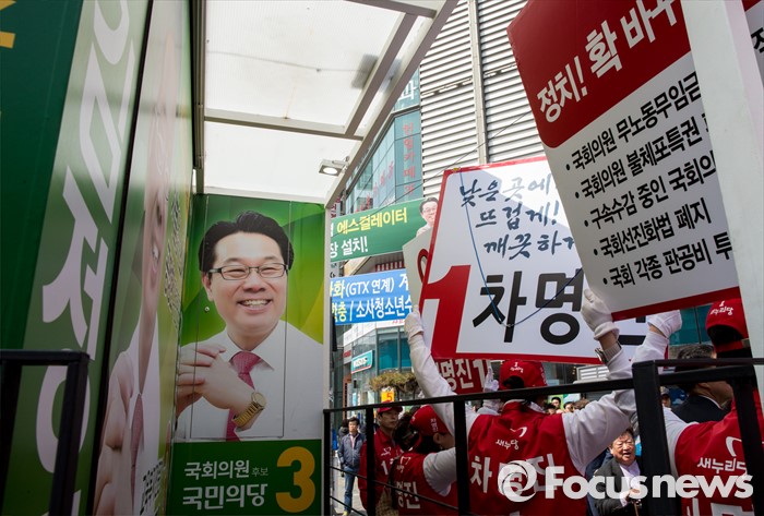 (부천=포커스뉴스) 8일 오전 경기 부천시 역곡역 인근에서 열린 차명진 새누리당 부천소사구 후보 지원유세에서 차 후보 유세차량 옆에 김정기 국민의당 후보 차량이 함께 주차돼 있다.