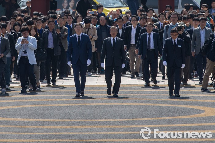 (광주=포커스뉴스) 문재인 더불어민주당 전 대표와 김홍걸 국민통합위원장이 8일 오전 전남 광주 5.18 민주묘지를 방문해 민주항쟁 추모탑으로 이동하고 있다.