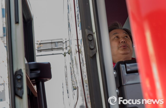 (부천=포커스뉴스) 8일 오전 경기 부천시 역곡역 인근에서 차명진 새누리당 부천소사구 후보 지원유세에서 나선 김무성 대표가 버스 안에서 한 숨 돌리고 있다.