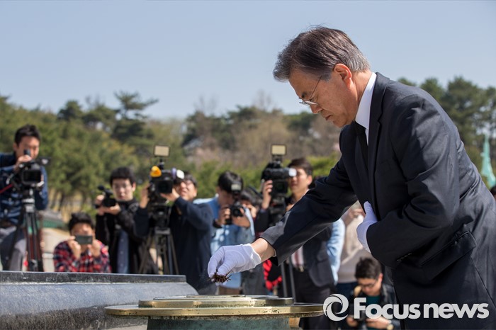 (광주=포커스뉴스) 문재인 더불어민주당 전 대표가 8일 오전 전남 광주 5.18 민주항쟁 추모탑을 찾아 분향 하고 있다.