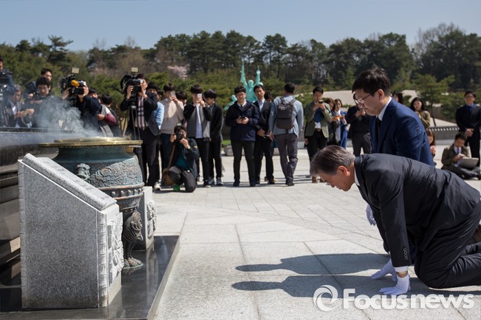 (광주=포커스뉴스) 문재인 더불어민주당 전 대표와 김홍걸 국민통합위원장이 8일 오전 전남 광주 5.18 민주항쟁 추모탑을 찾아 무릎을 꿇고 참배 하고 있다.