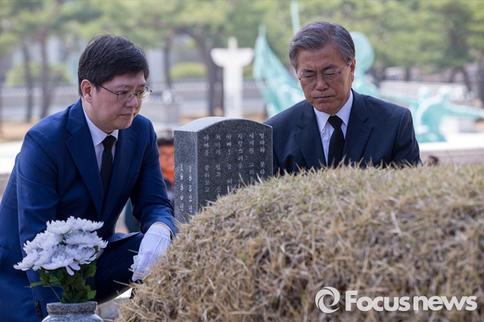 (광주=포커스뉴스) 문재인 더불어민주당 전 대표와 김홍걸 국민통합위원장이 8일 오전 전남 광주 5.18 민주묘지를 찾아 민주열사 묘지를 둘러 보고 있다.