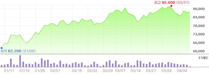 그는 그러면서 "사우디아라비아의 주요 공사 준공이 가까워짐에 따라 실적 불확실성은 2분기까지 남아 있다"면서도 "선제적 충당금 확보로 추가 손실이 발생해도 충격은 크지 않을 것"이라고 내다봤다.최근 3개월간 대림산업 주가 추이 <그래픽출처=네이버>