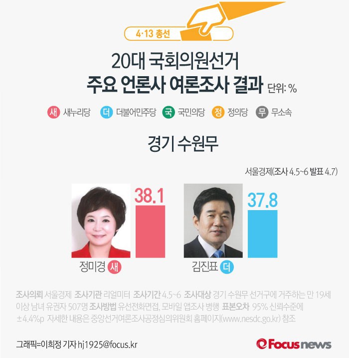 서울경제가 여론조사기관 리얼미터에 의뢰해 7일 발표한 결과에 따르면 경기 수원무 후보지지도는 정미경 후보, 김진표 후보, 국민의당 김용석 후보 순으로 나타났다.