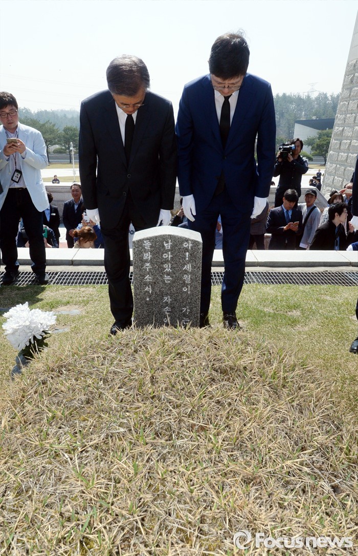 (광주=포커스뉴스) 8일 오른 광주 국립 518묘지를 찾은 더불어민주당 문재인(왼쪽) 전 대표와 김홍걸 국민통합위원장이 묘역을 참배하고 있다.