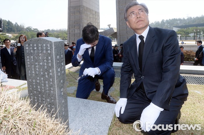 (광주=포커스뉴스) 8일 오전 광주 국립 518묘지를 찾은 더불어민주당 문재인(오른쪽) 전 대표와 김홍걸 국민통합위원장이 묘역을 참배하고 있다.