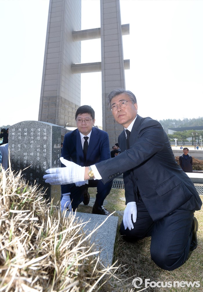 | △ 묘비 어루 만지는 문재인 |