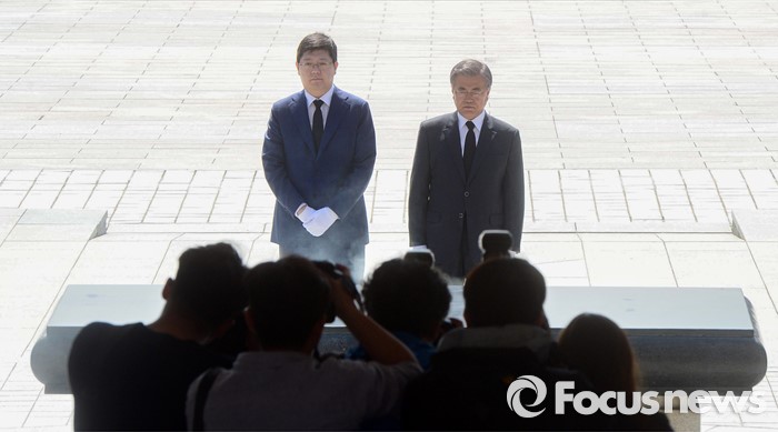 (광주=포커스뉴스) 8일 오전 광주 국립 518묘지를 찾은 더불어민주당 문재인(오른쪽) 전 대표와 김홍걸 국민통합위원장이 헌화를 한 뒤,분향하고 있다.