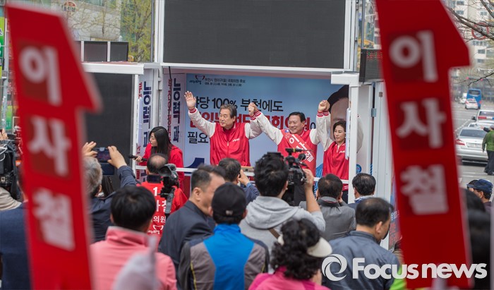 (부천=포커스뉴스) 8일 오후 경기 부천시 역곡역 인근에서 이사철 새누리당 부천원미을 후보 지원유세에 나선 김무성 대표가 유권자들의 지지를 호소하고 있다.