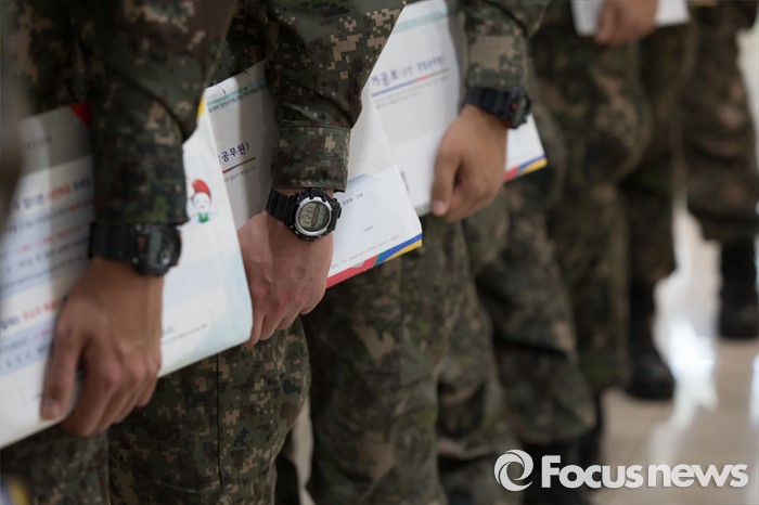 (서울=포커스뉴스) 4.13총선 사전투표 첫째날인 8일 오후 서울 서초구 방배4동 주민센터에 설치된 사전투표소에서 수방사 장병들이 투표를 하기위해 기다리고 있다.