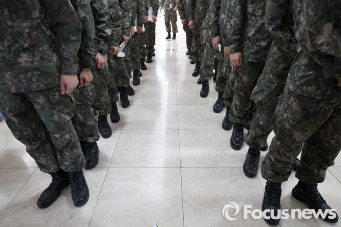 (서울=포커스뉴스) 4.13총선 사전투표 첫째날인 8일 오후 서울 서초구 방배4동 주민센터에 설치된 사전투표소에서 수방사 장병들이 투표를 하기위해 기다리고 있다.