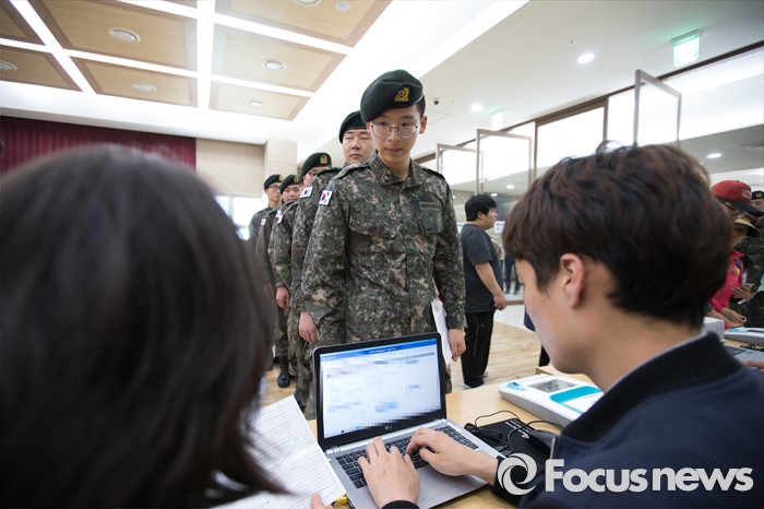 (서울=포커스뉴스) 4.13총선 사전투표 첫째날인 8일 오후 서울 서초구 방배4동 주민센터에 설치된 사전투표소에서 수방사 장병들이 투표를 하기위해 신원조회를 하고 있다.