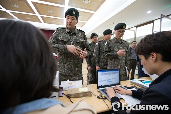 (서울=포커스뉴스) 4.13총선 사전투표 첫째날인 8일 오후 서울 서초구 방배4동 주민센터에 설치된 사전투표소에서 수방사 장병들이 투표를 하기위해 신원조회를 하고 있다.