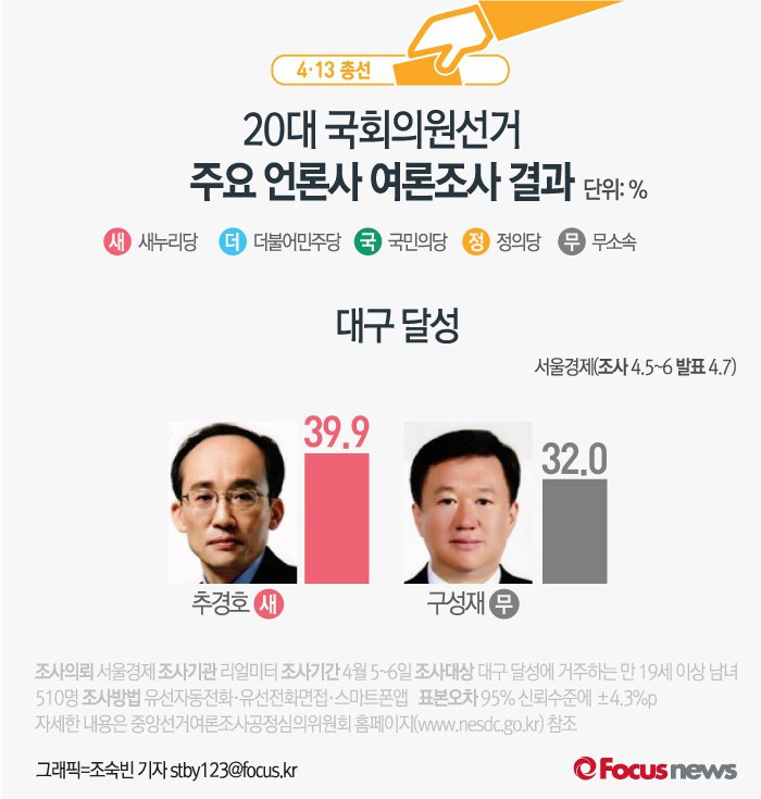 (서울=포커스뉴스) 서울경제가 여론조사기관 리얼미터에 의뢰해 7일 발표한 결과에 따르면 대구 달성에서 새누리당 추경호 후보의 지지율은 39.9%, 무소속 구성재 후보의 지지율은 32.0%인 것으로 나타났다.