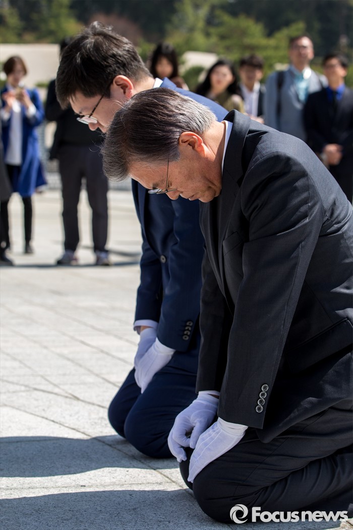 총선 승리를 다짐하면서 문 전 대표는 광주 시민들을 향해 "호남 정신의 지평을 전국으로 넓히면서 지역 경제, 문화에 새 바람을 이끌 주역들"이라며 이번 광주 지역에 출마한 자당 후보들에 대한 지지를 호소했다.문재인 더불어민주당 전 대표와 김홍걸 국민통합위원장이 8일 오전 전남 광주 5.18 민주항쟁 추모탑을 찾아 무릎을 꿇고 참배 하고 있다. 2016.04.08 강진형 기자