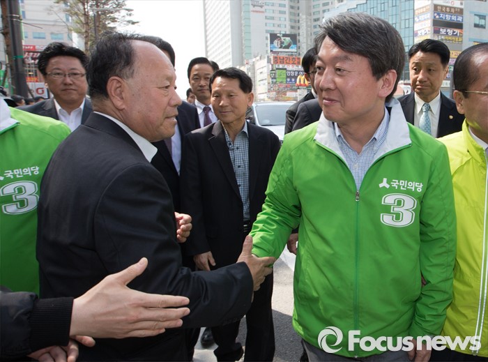 (천안=포커스뉴스) 안철수 국민의당 대표가 8일 오후 충남 천안 신부동 신세계백화점 앞에서 시민과 악수를 하고 있다.