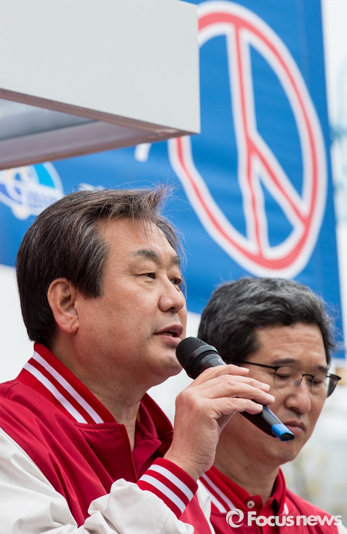 (김포=포커스뉴스) 8일 오후 경기 김포시 사우동 인근에서 김동식 새누리당 김포갑, 홍철호 김포을 후보 합동지원유세에 나선 김무성 대표가 유권자들의 지지를 호소하고 있다.