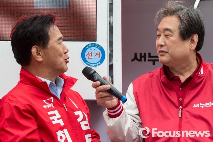 (김포=포커스뉴스) 8일 오후 경기 김포시 사우동 인근에서 김동식 새누리당 김포갑, 홍철호 김포을 후보 합동지원유세에 나선 김무성 대표가 김 후보에게 마이크를 넘기고 있다.