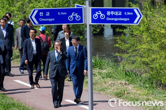 (광주=포커스뉴스) 문재인(앞줄 왼쪽) 더불어민주당 전 대표와 김홍걸(앞줄 오른쪽) 국민통합위원장이 8일 오후 전남 광주 서구 광주천일대를 거닐며 지역주민들과 인사 하고 있다.