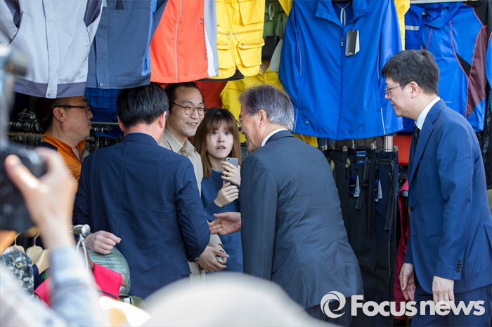 (광주=포커스뉴스) 문재인(오른쪽 두번째) 더불어민주당 전 대표와 김홍걸(오른쪽) 국민통합위원장이 8일 오후 광주시 양동전통시장을 방문해 상인과 대화를 나누고 있다.
