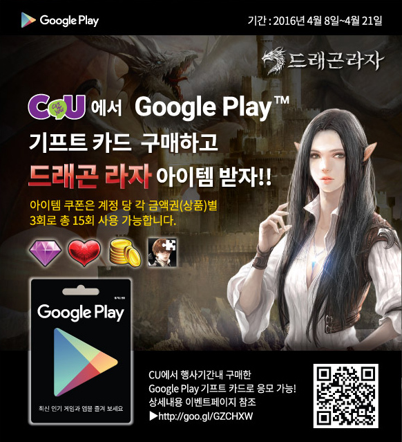 이벤트 아이템 수령은 구글 플레이 기프트 카드 뒷면에 적힌 16자리 바코드 번호와 휴대 전화 번호를 이벤트 페이지(goo.gl/GZCHXW)에 등록한 후 문자로 수신된 쿠폰 번호를 드래곤라자 게임 내에서 입력하면 된다.