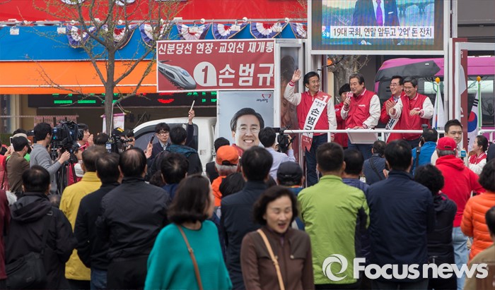 (고양=포커스뉴스) 8일 오후 경기 고양시 화정역 광장에서 손범규 새누리당 고양갑, 김태원 고양을 후보 합동지원유세를 가진 김무성 대표가 유권자들의 지지를 호소하고 있다.