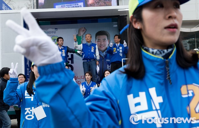 (파주=포커스뉴스) 김종인 더불어민주당 비대위 대표 겸 선대위원장이 8일 오후 경기 파주 금촌역 앞에서 윤후덕 파주시갑 후보와 박정 파주시을 후보 합동지원유세를 하고 있다.