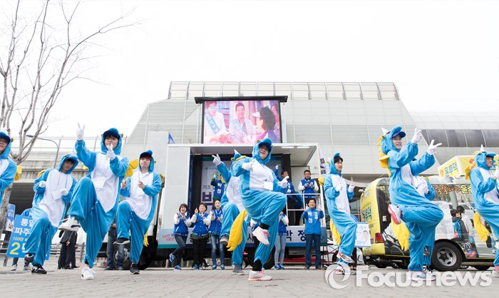 (파주=포커스뉴스) 김종인 더불어민주당 비대위 대표 겸 선대위원장이 8일 오후 경기 파주 금촌역 앞에서 박정 파주시을 후보 선거운동원들이 지지를 호소하고 있다.
