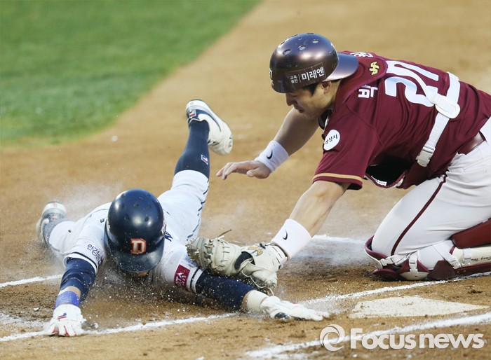 (서울=포커스뉴스) 8일 서울 잠실구장에서 열린 2016 프로야구 넥센-두산 경기 1회말 1사 1,3루에서 더블스틸을 시도하던 두산 3루주자 정수빈이 홈에서 넥센 포수 박동원에게 태그아웃 되고 있다.
