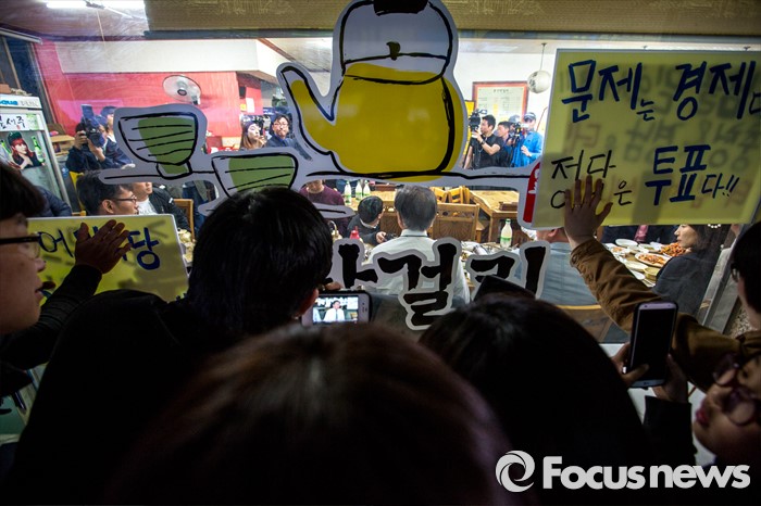 (광주=포커스뉴스) 8일 오후 광주광역시 광산구 월곡시장 인근 막걸리집에서 문재인 더불어민주당 전 대표가 지역 4050 주민들과 간담회를 진행하자 음식점 외부에 모인 지지자들이 문 전 대표를 응원하는 피켓을 들고 있다.