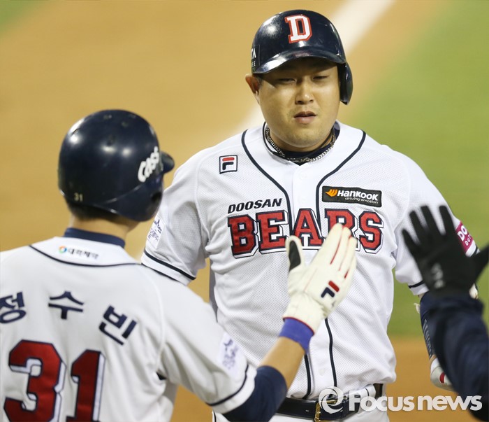 (서울=포커스뉴스) 8일 서울 잠실구장에서 열린 2016 프로야구 넥센-두산 경기 3회말 2사 2,3루에서 두산 양의지가 좌월 3점 홈런을 치고 홈인하며 선행주자 정수빈의 환영을 받고 있다.