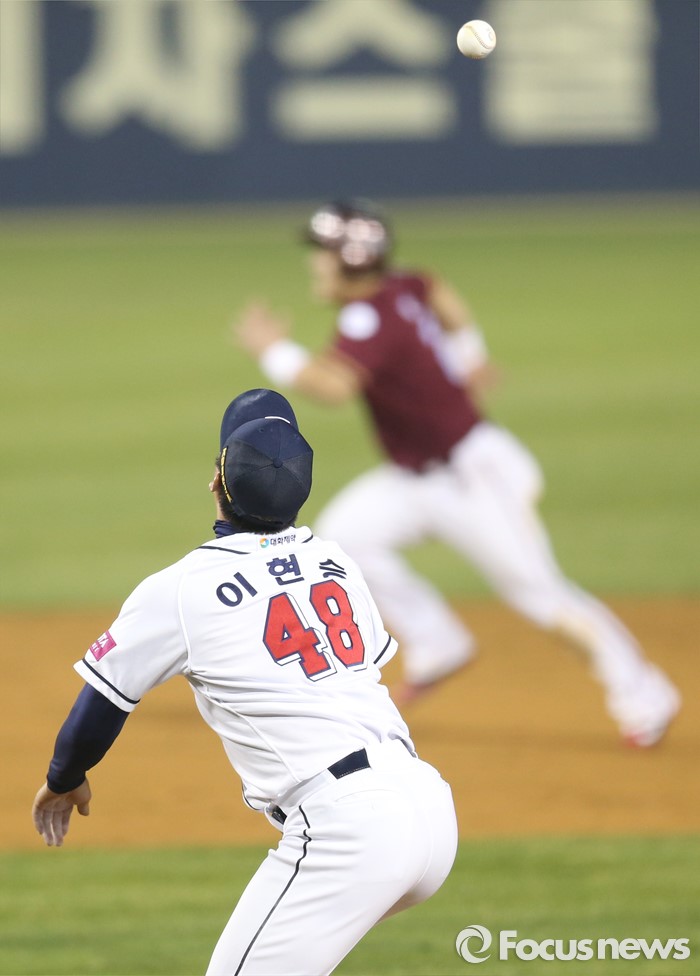 (서울=포커스뉴스) 8일 서울 잠실구장에서 열린 2016 프로야구 넥센-두산 경기 9회초 2사 1,2루에서 두산 투수 이현승이 높이 바운드된 넥센 임병욱의 투수앞 땅볼을 잡고 있다.