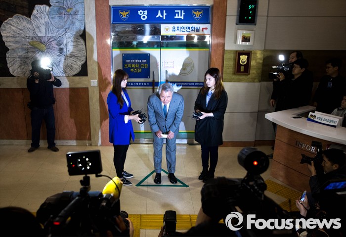 (서울=포커스뉴스) 정우현 MPK그룹 회장이 경찰 조사를 받기 위해 9일 오전 서울 서대문경찰서에 출석, 취재진 앞에서 고개 숙여 사과하고 있다. '미스터피자'를 운영하는 MPK 그룹의 정 회장은 지난 2일 서대문구의 한 건물 경비원 황모(58)씨의 뺨을 때린 혐의를 받고 있다.