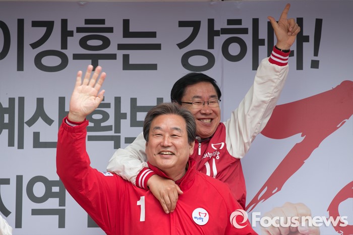 (원주=포커스뉴스) 제20대 국회의원 선거를 나흘 앞둔 9일 오전 강원도 원주시 치악로 남부시장 앞에서 김무성(앞) 새누리당 대표가 김기선 원주갑, 이강후(뒤) 원주을 후보 지원유세에 참석해, 이 후보를 업고 있다.