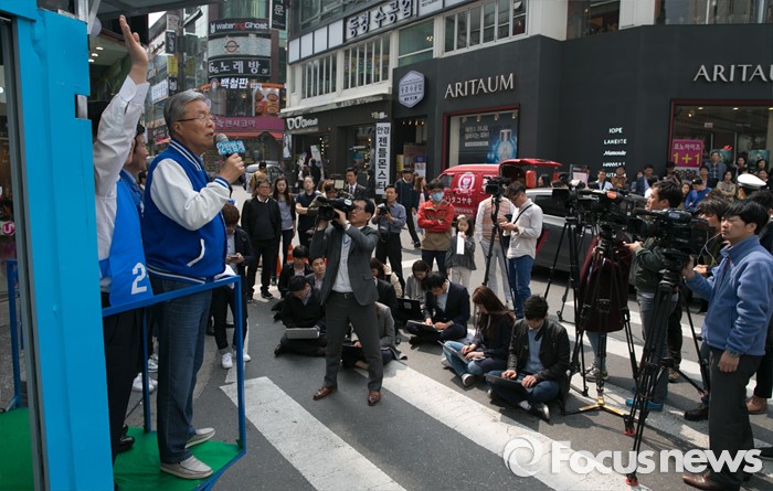 (대전=포커스뉴스) 9일 오후 대전 갤러리아백화점 타임월드점 앞에서 열린 더불어민주당 대전 서구 합동유세에 참석한 김종인 비대위 대표 겸 선대위원장이 지지를 호소하고 있다.