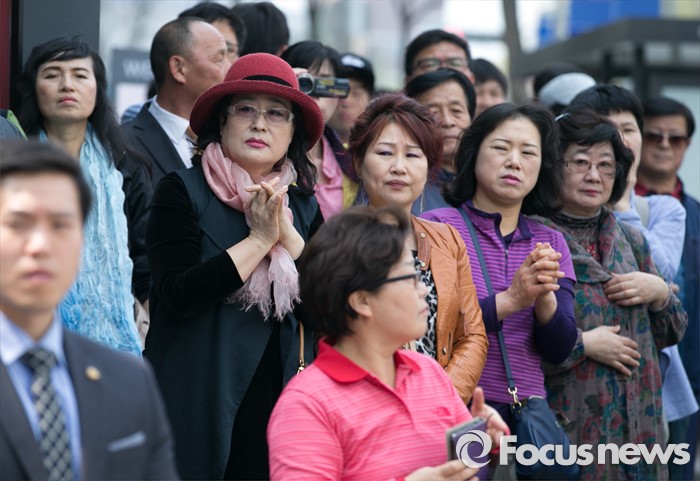 (대전=포커스뉴스) 9일 오후 대전 갤러리아백화점 타임월드점 앞에서 시민 및 지지자들이 더불어민주당 대전 서구 합동유세를 지켜보고 있다.