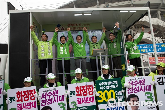 (수원=포커스뉴스) 9일 오후 수원시 장안구 수원종합운동장에서 열린 국민의당 합동유세에 참석한 안철수 대표가 후보자들과 함꼐 손을 잡고 총선 승리를 위해 결의를 다지고 있다.