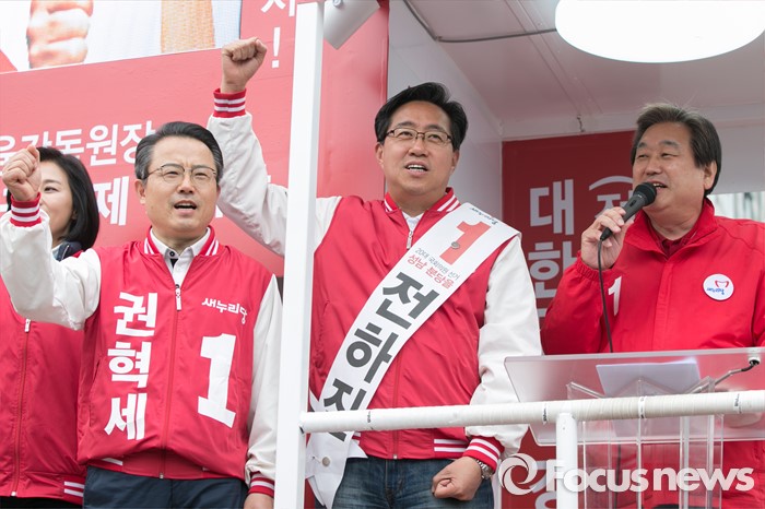 (성남=포커스뉴스) 제20대 국회의원 선거를 나흘 앞둔 9일 오후 성남시 분당구 야탑역 광장에서 김무성(오른쪽) 새누리당 대표가 권혁세(왼쪽) 분당갑, 전하진(가운데) 분당을 후보 지원유세를 하고 있다.