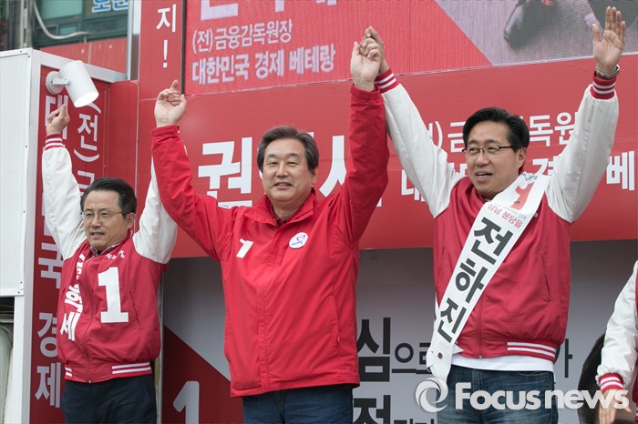 (성남=포커스뉴스) 제20대 국회의원 선거를 나흘 앞둔 9일 오후 성남시 분당구 야탑역 광장에서 김무성(가운데) 새누리당 대표가 권혁세(왼쪽) 분당갑, 전하진(오른쪽) 분당을 후보 지원유세를 하고 있다.
