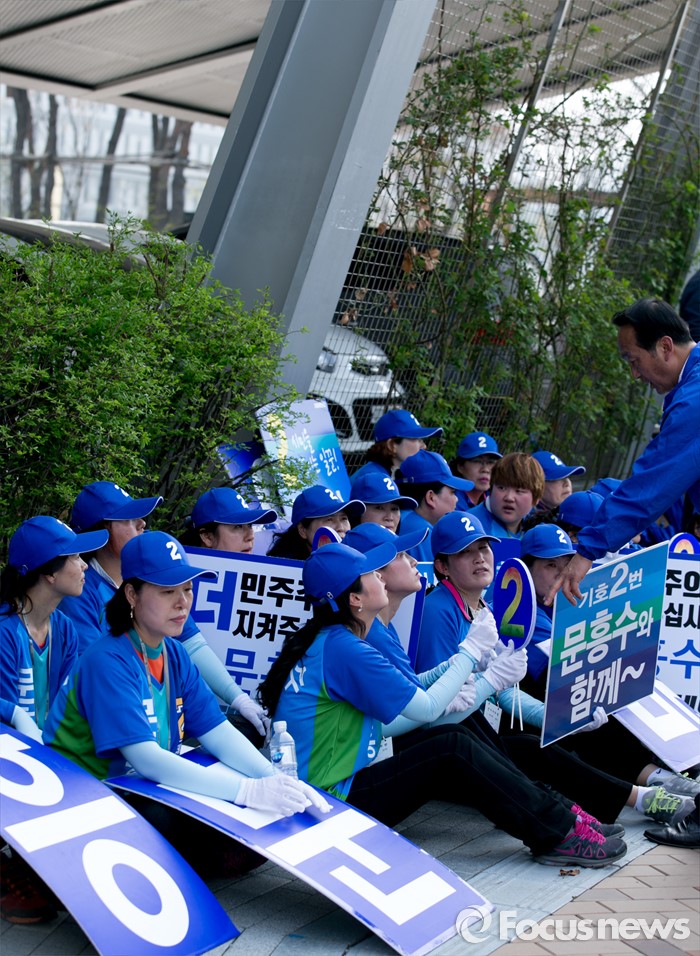 (세종=포커스뉴스) 9일 오후 세종시 국립세종도서관 앞에서 문흥수 더불어민주당 세종시 후보의 선거운동원들이 김종인 비대위 대표 겸 선대위원장을 기다리며 그늘에서 휴식을 보내고 있다.