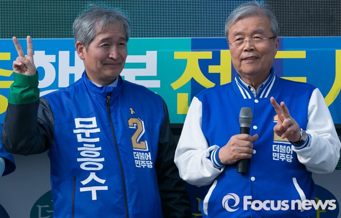 (세종=포커스뉴스) 9일 오후 세종시 국립세종도서관 앞에서 김종인(오른쪽) 더불어민주당 비대위 대표 겸 선대위원장과 문흥수 세종시 후보가 선거유세를 하고 있다.