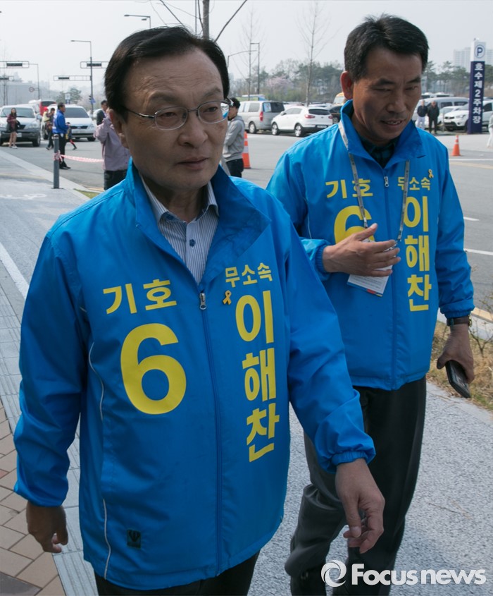(세종=포커스뉴스) 9일 오후 세종시 국립세종도서관 앞에서 이해찬(왼쪽) 무소속 세종시 후보가 선거운동을 위해 이동하고 있다.