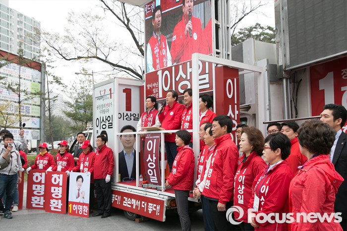(용인=포커스뉴스) 제20대 국회의원 선거를 나흘 앞둔 9일 오후 경기도 용인시 기흥구 죽현마을 중앙공원에서 김무성(차량 위 왼쪽 두번째) 새누리당 대표가 이상일 용인정, 허명환 용인을 후보 지원유세를 하고 있다.