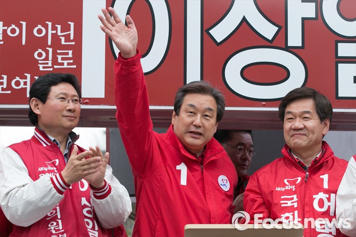 (용인=포커스뉴스) 제20대 국회의원 선거를 나흘 앞둔 9일 오후 경기도 용인시 기흥구 죽현마을 중앙공원에서 김무성(가운데) 새누리당 대표가 이상일(왼쪽) 용인정, 허명환(오른쪽) 용인을 후보 지원유세를 마친 뒤, 손을 흔들고 있다.