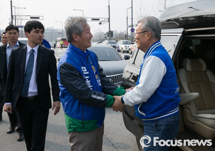 (세종=포커스뉴스) 9일 오후 세종시 국립세종도서관 앞에서 김종인(오른쪽) 더불어민주당 비대위 대표 겸 선대위원장과 문흥수 세종시 후보가 선거유세에 앞서 인사하고 있다.