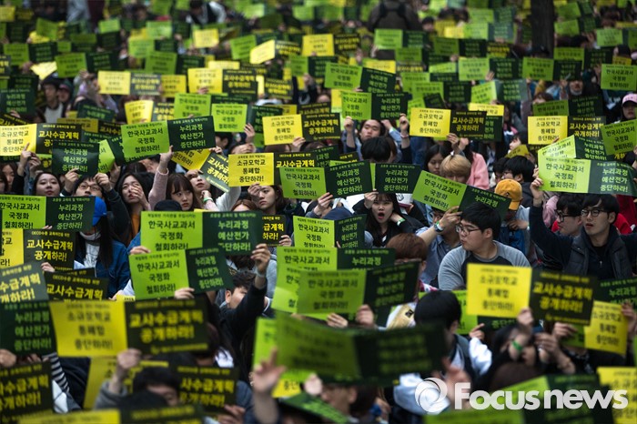 (서울=포커스뉴스) 9일 오후 서울 종로구 영풍문고 앞에서 '한국사 국정화 교과서 폐기 및 공교육 정상화를 위한 전국 초등예비교사 총궐기' 집회가 열리고 있다.