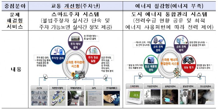 장석영 미래부 인터넷융합정책관은 “세계적인 스마트시티 성공사례를 창출해 도시민의 삶의 질을 높이고 IoT 산업의 글로벌 경쟁력을 확보해 나갈 것”이라고 밝혔다.도시문제 해결형 IoT 융·복합 서비스 예시.<표제공=미래부>