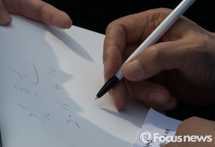 (서울=포커스뉴스) 김종인 더불어민주당 비대위 대표 겸 선대위원장과 전혜숙 광진갑 후보가 10일 오전 서울 어린이대공원 앞에서 한 시민에게 사인을 해주고 있다.